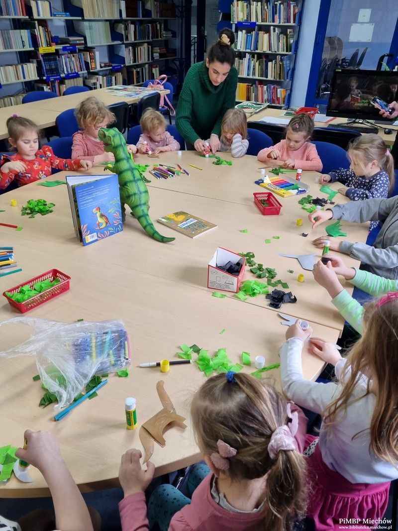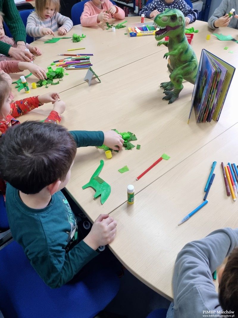Podczas spotkania dzieci dowiedziały się, jak nazywają się najbardziej znane z olbrzymich gadów (chyba każdy słyszał o tyranozaurze, prawda?), w jaki sposób poruszały się (na dwóch, a może czterech łapach?) i co jadły (stąd podział na dinozaury mięsożerne, roślinożerne, a nawet wszystkożerne). Były również zagadki oraz praca plastyczna (dinozaur z bibuły).