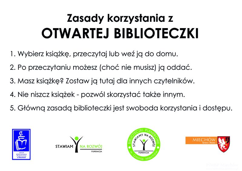 Otwarta biblioteczka – to nowy pomysł, dzięki któremu miechowska biblioteka planuje zachęcić czytelników do wizyty w swoich progach. Na czym polega jej działanie? Można wybrać przypadający do gustu tytuł, przeczytać go na miejscu lub zabrać ze sobą. Największą radość czytelnikom sprawi zapewne fakt, iż dzieła literackie z otwartej biblioteczki niekoniecznie trzeba zwracać. To już leży w gestii czytelnika. Tak samo, jak decyzja, czy do arsenału lektur nie dołączyć własnej książki, np. takiej, którą możemy zadowolić kolejnych użytkowników otwartej biblioteczki. W ten sposób lektura zyska nowe życie.