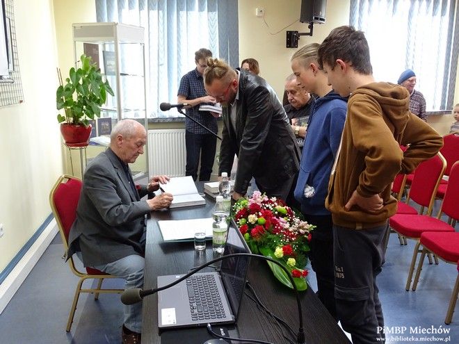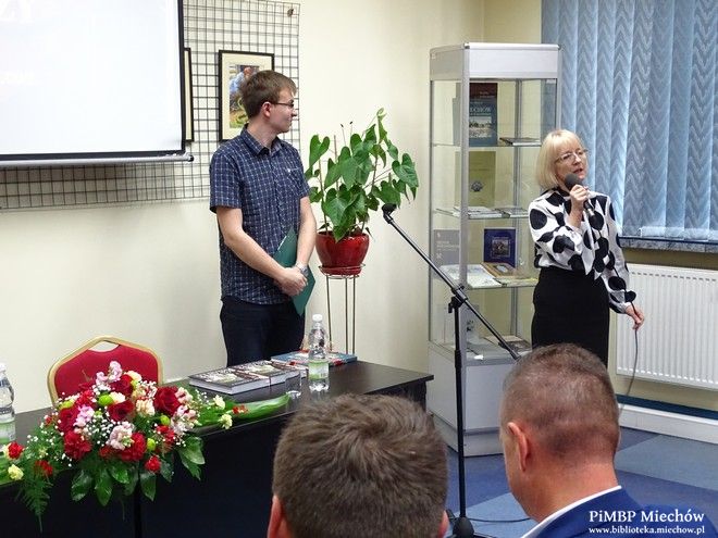 Po niemal półtoragodzinnym wystąpieniu przyszedł czas na pytania od publiczności. Z radością informujemy, że słuchaczy dwa razy nie trzeba było do tego zachęcać. Tylko z powodu napiętego grafiku pana Jacka spotkanie autorskie musiało dobiec końca. Czekał go jeszcze powrót do Warszawy. Jako pamiątkę z pierwszej (ufamy, że nie ostatniej) podróży do Miechowa, pogromca Atlantyku otrzymał od nas książkę Jerzego Malatyńskiego pt. „Miechów na dawnych pocztówkach”. Oby przypominała polskiemu eksploratorowi, jak wielką estymą cieszy się wśród naszych Czytelników.