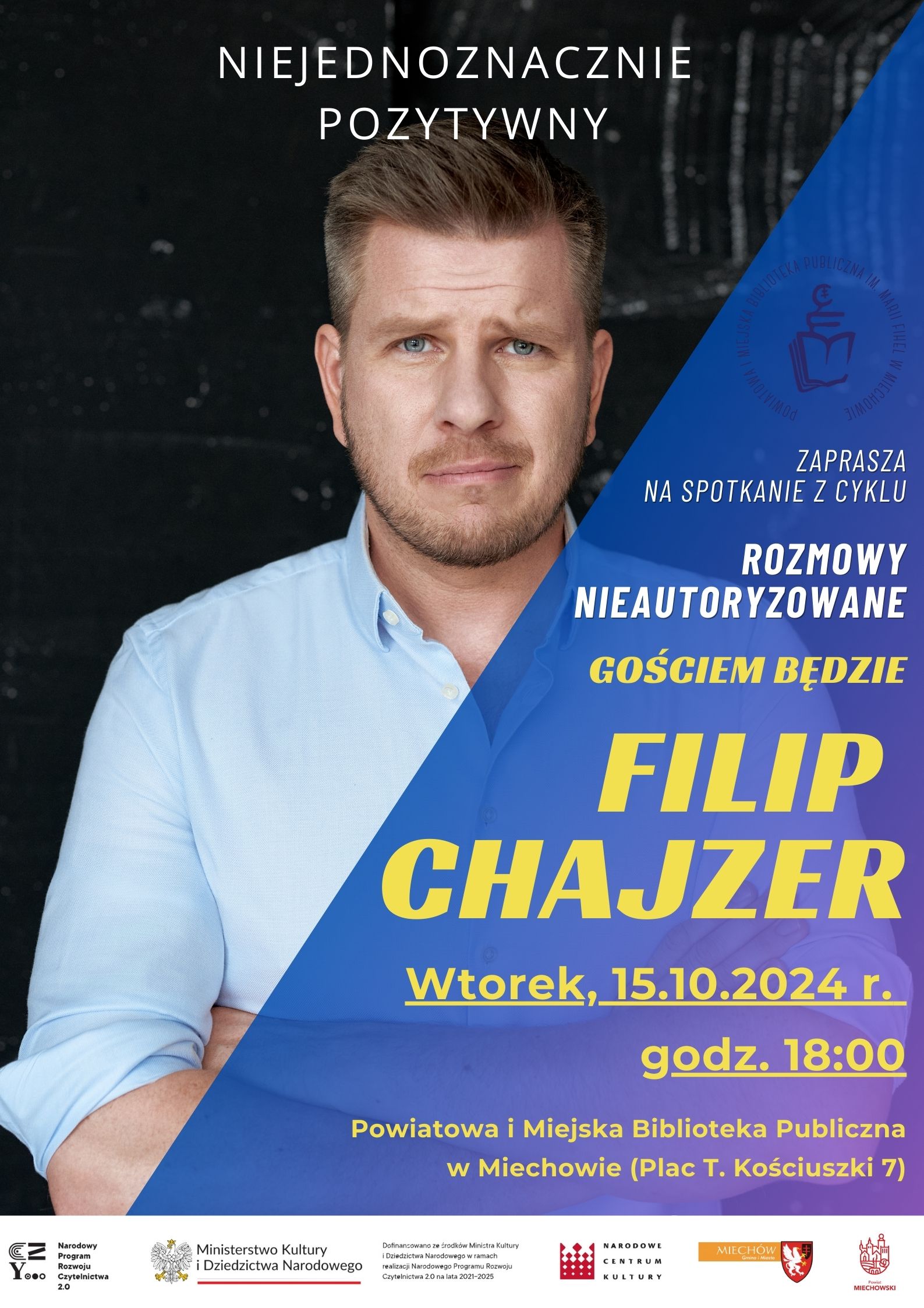 Powiatowa i Miejska Biblioteka Publiczna im. Marii Fihel w Miechowie zaprasza 15 października o godz. 18.00 na spotkanie autorskie z Filipem Chajzerem – dziennikarzem i prezenterem telewizyjnym. Wydarzenie jest częścią cyklu „Rozmowy nieautoryzowane” – szczerego dialogu z autorami książek i postaciami życia publicznego.