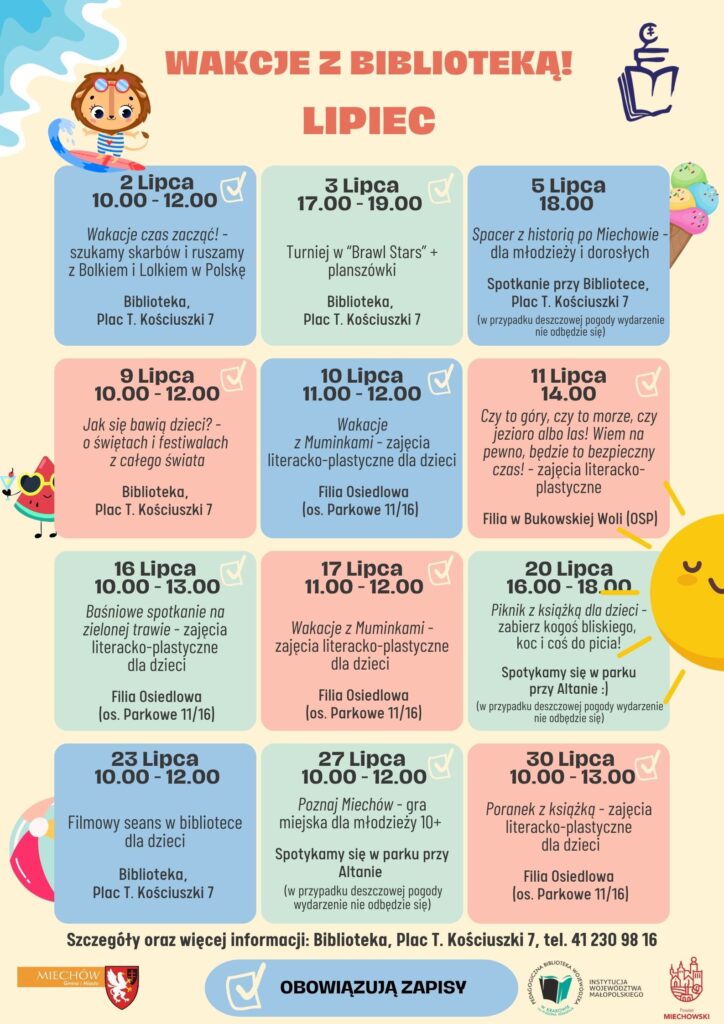 Lato to czas relaksu, przygód i odkrywania nowych pasji. Miechowska Biblioteka zaprasza do udziału w przygotowanych wydarzeniach dla dzieci, młodzieży a nawet dla dorosłych! Nasze wakacyjne zajęcia będą się odbywać w różnych lokalizacjach – w parku, w Filii Osiedlowej, w Filii w Bukowskiej Woli oraz w Bibliotece Miejskiej przy Placu Tadeusza Kościuszki 7. Zapraszamy do udziału i mamy nadzieję, że każdy znajdzie coś dla siebie 🙂